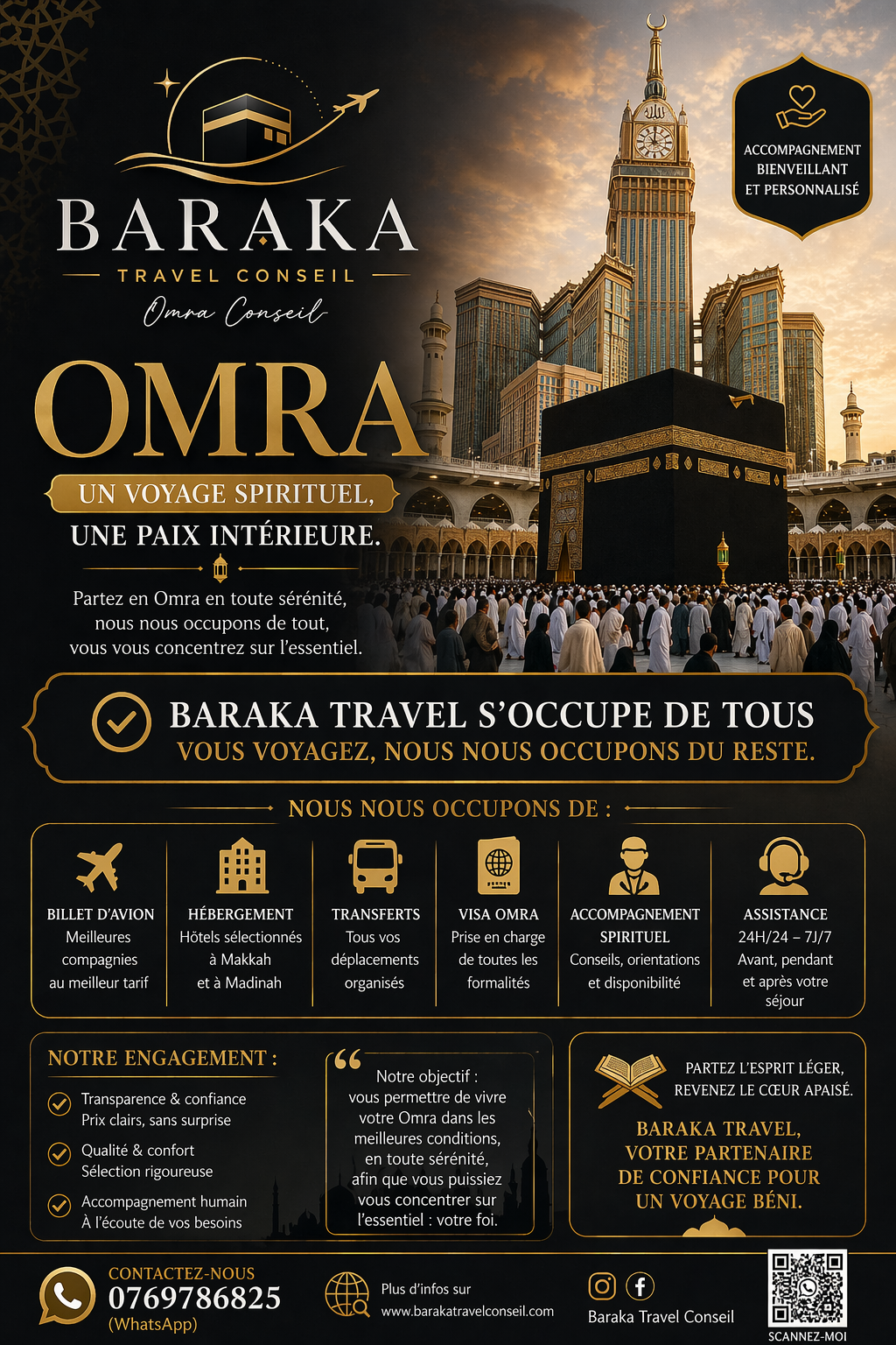 "L'équipe de Baraka Travel Conseil a organisé mon voyage Omra avec une telle précision et une humanité remarquable. Une expérience inoubliable et sans aucun souci !"